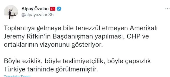 AK Parti İzmir Milletvekili Alpay Özalan; Toplantıya gelmeye bile tenezzül etmeyen Amerikalı Jeremy Rifkin'in Başdanışman yapılması, CHP ve ortaklarının vizyonunu gösteriyor. Böyle eziklik, böyle teslimiyetçilik, böyle çapsızlık Türkiye tarihinde görülmemiştir.