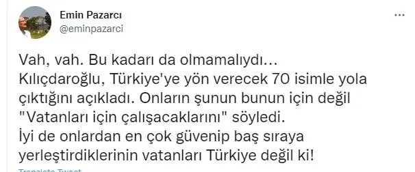 Akşam Gazetesi Ankara Temsilcisi Emin Pazarcı ise; Vah, vah. Bu kadarı da olmamalıydı... Kılıçdaroğlu, Türkiye'ye yön verecek 70 isimle yola çıktığını açıkladı. Onların şunun bunun için değil "Vatanları için çalışacaklarını" söyledi. İyi de onlardan en çok güvenip baş sıraya yerleştirdiklerinin vatanları Türkiye değil ki!